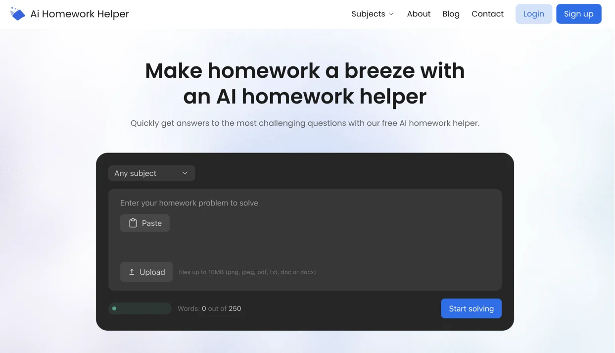 AIHomeworkHelper is a simple browser tool built for one job: turning a homework prompt into an answer you’re looking for. You can paste your question, or upload a photo or PDF.