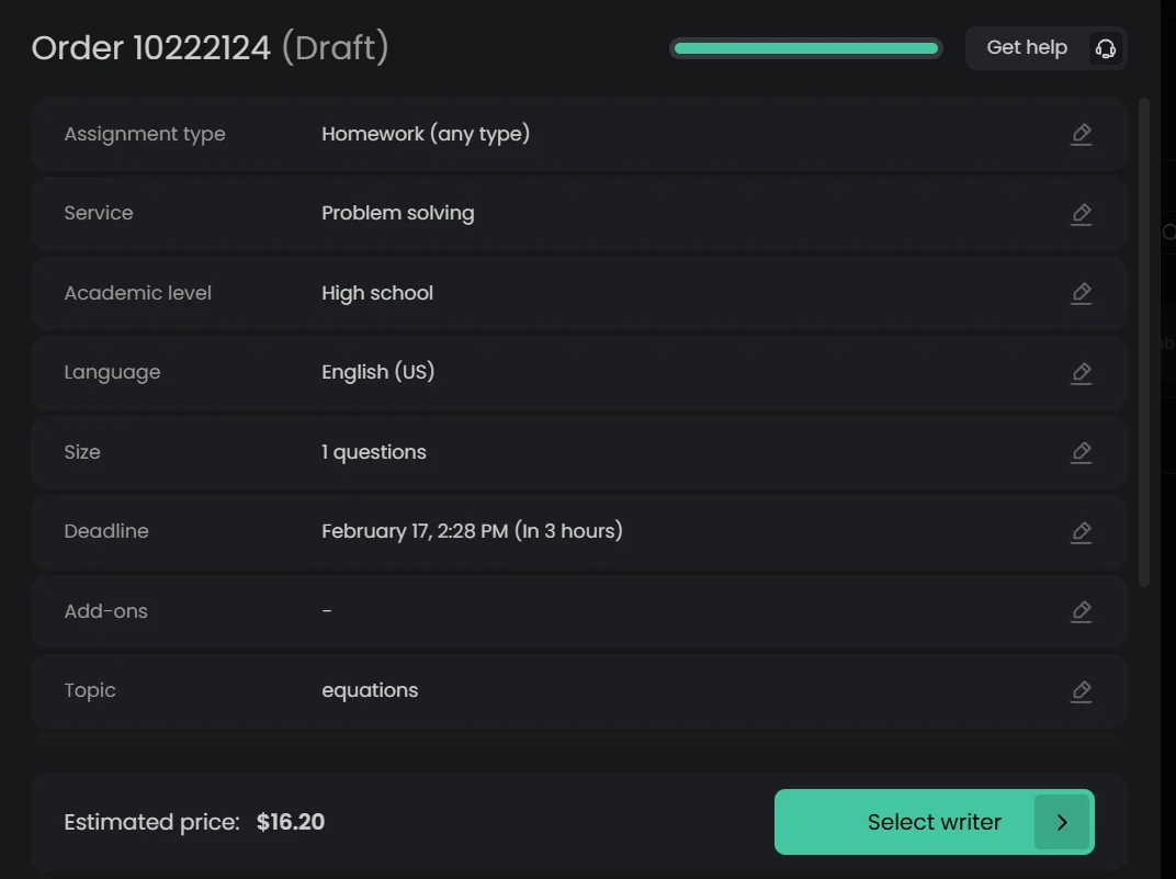If you do need a human to step in, the platform’s expert help is also pretty affordable. For example, for high school algebra with an urgent 3-hour deadline, the price is $16.20. If it’s the same kind of help but you order 5 days in advance, it drops to $10.80.