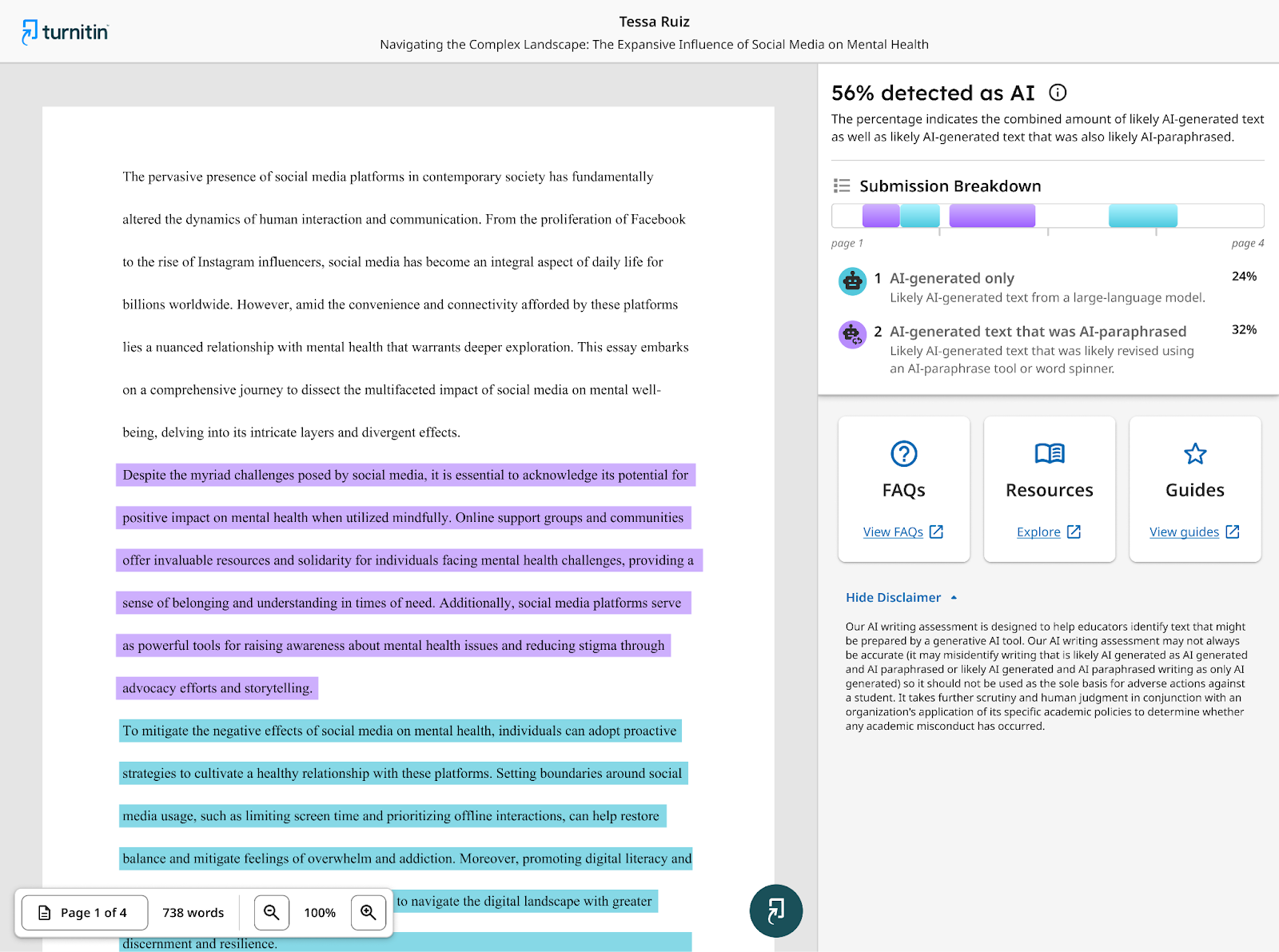The AI Writing Report differentiates between AI-generated and AI-paraphrased content: the former is highlighted in cyan, and the latter uses purple.